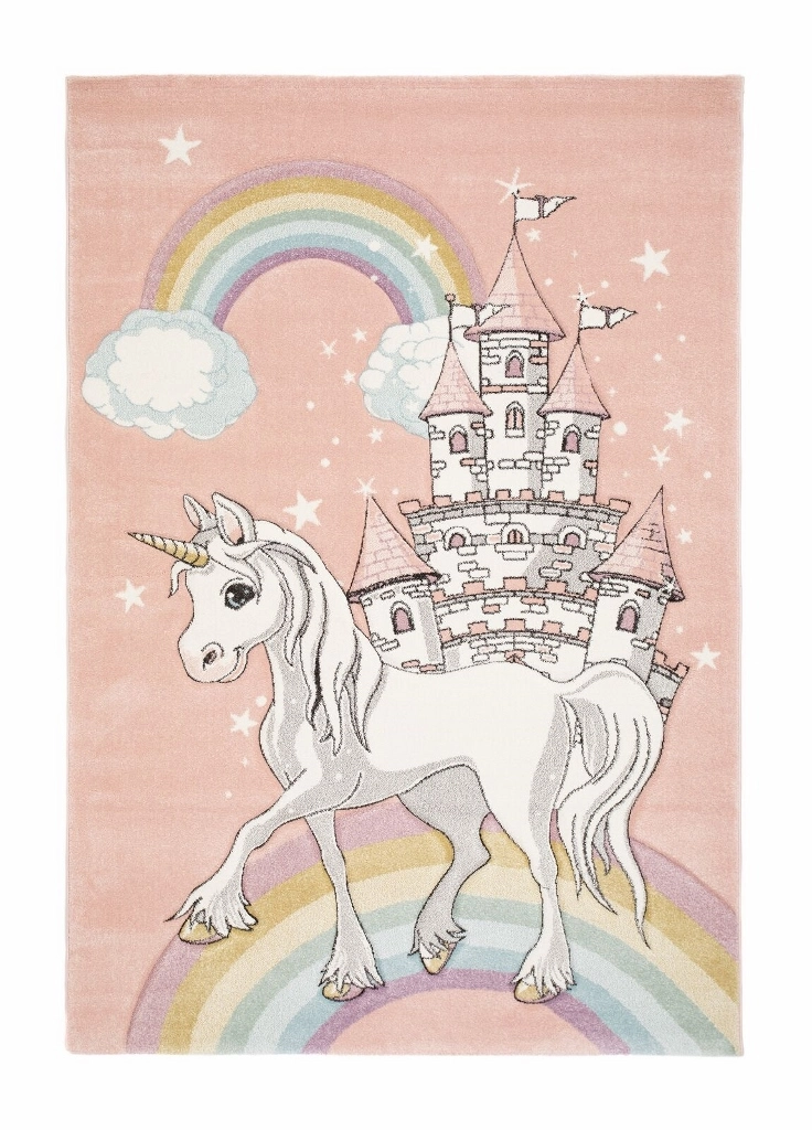 Atlas Castle har rosa bottenfärg med matchande langettering på långsidorna. Mattan pryds utav en vit enhörning som står framför ett vackert slott och en magisk regnbåge i fina pastellfärger. Atlas Castle är maskinvävd och gjord i carvingteknik, vilket innebär att den har utskärningar för att få detaljer mer framträdande.
