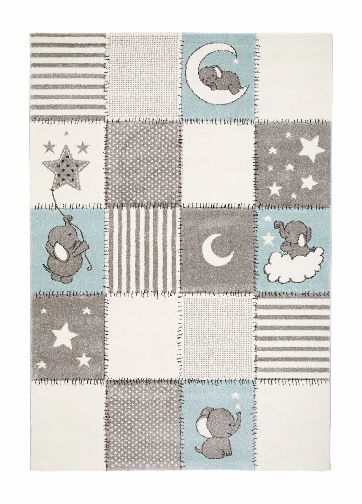 Atlas Cute Elephant har vit bottenfärg med turkost och grått rutmönster i patchlook. Mattan pryds av flera stjärnor, fluffiga moln och små söta elefanter. Atlas Cute Elephant har en grå langettering på långsidorna och är gjord i carvingteknik, vilket innebär att den har utskärningar för att detaljer skall bli mer framträdande.