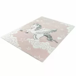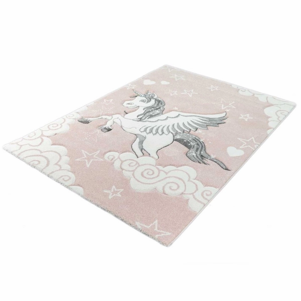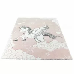 Enhörning är en fin barnmatta med rosa bottenfärg och ett lekfullt mönster med en enhörning. Hela mattan har ett mönster som pryder den med stjärnor och som för tankarna till Askungen. Mattan är tillverkad i polypropylen, ett syntetmaterial som är lätt att rengöra och hålla fri från damm och ludd. Tack vare korta fibrer tränger inte smuts in lika lätt som på en matta med längre fibrer.
