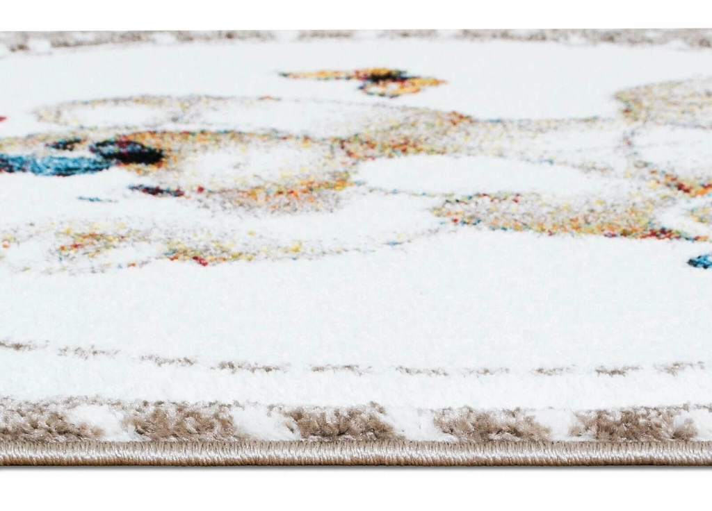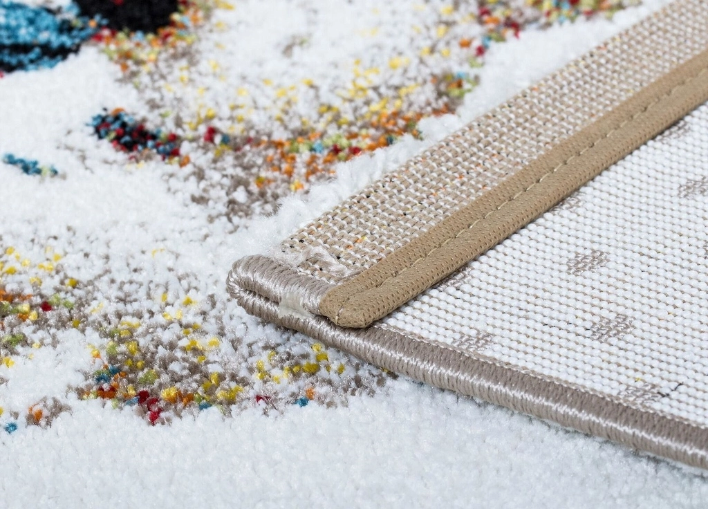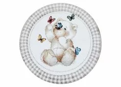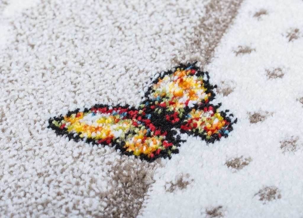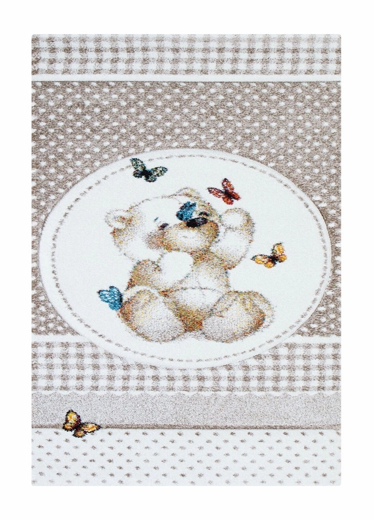 Atlas Teddybear har en linnefärgad bottenfärg och matchande langettering på långsidorna. Mattan har ett vitt rutmönster som pryds av en söt nallebjörn och små fjärilar i olika nyanser. Atlas Teddybear har en kort skuren lugg och är maskinvävd i polypropylen, vilket är ett syntetmaterial som är lätt att rengöra och hålla fri ifrån ludd och damm.