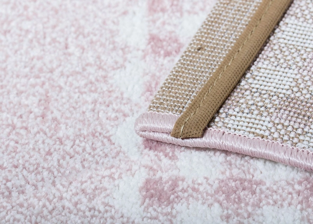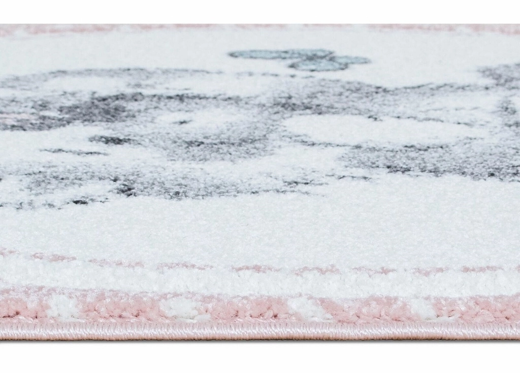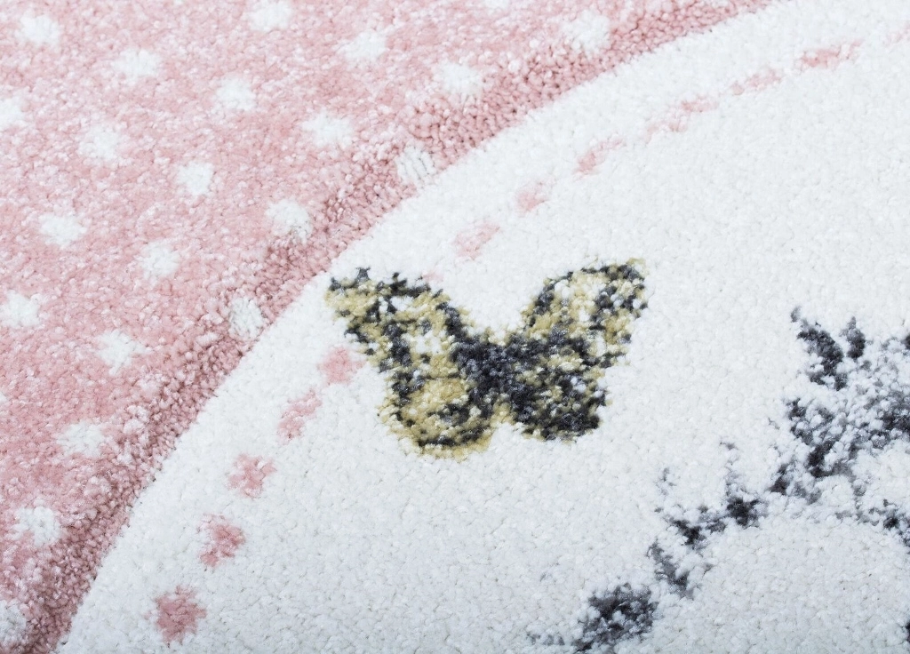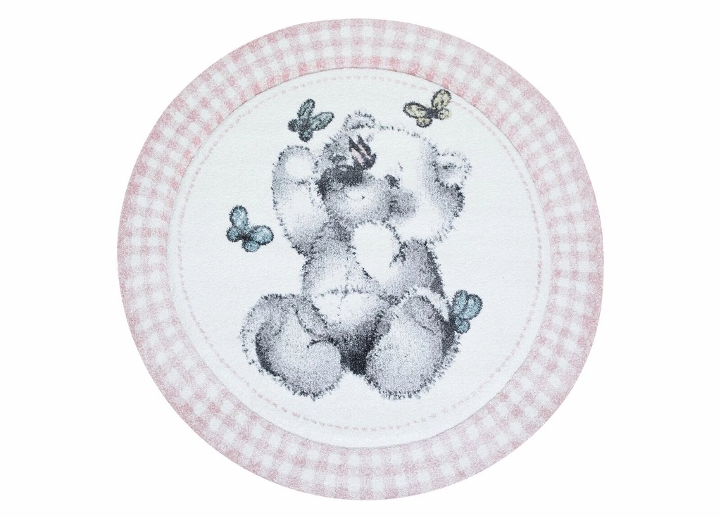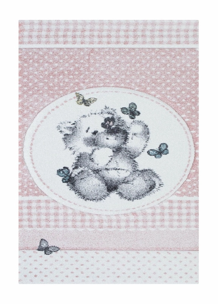 Atlas Teddybear har en rosa bottenfärg och matchande langettering på långsidorna. Mattan har ett vitt rutmönster som pryds av en söt nallebjörn och små fjärilar i olika nyanser. Atlas Teddybear har en kort skuren lugg och är maskinvävd i polypropylen, vilket är ett syntetmaterial som är lätt att rengöra och hålla fri ifrån ludd och damm.