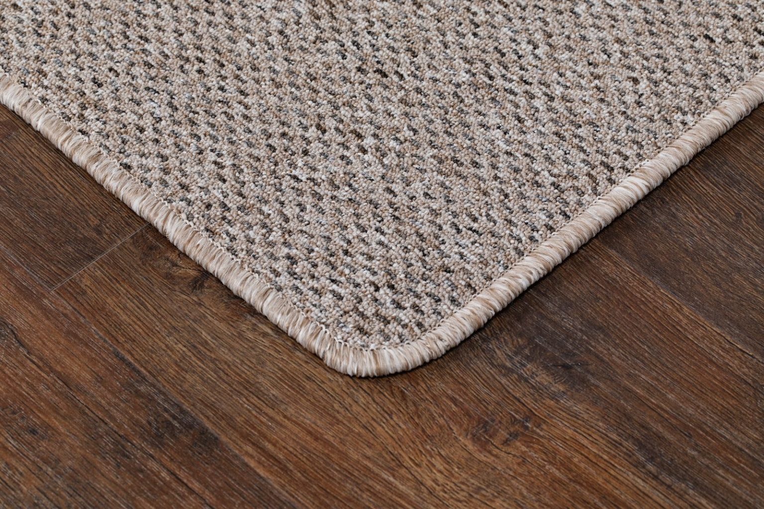 Bello Natur har en naturfärgad botten och varvas med mörkare och ljusare grå som ger en mjukare och lätt melerad effekt. Längs kanterna går en matchande langettering och hörnen är snyggt rundade.