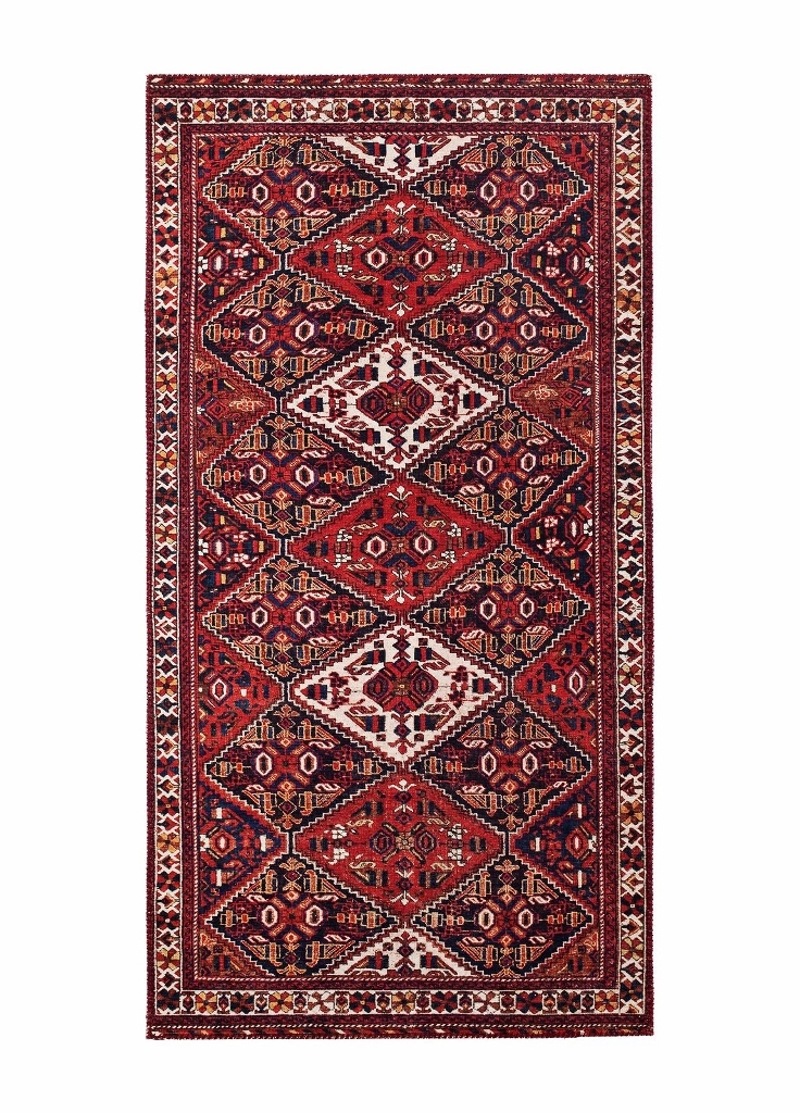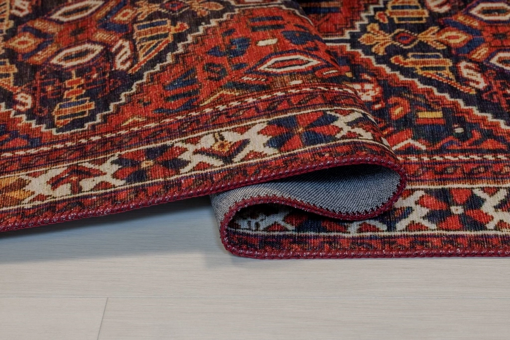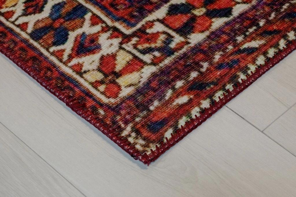 Cleo Hamadan är en elegant matta med orientalisk inspiration. Mattan har en vinröd bottenfärg med tryckt mönster som går i tonerna creme, blå samt guld. Mattans kanter pryds utav en sydd langettering som består av riktiga stygn i matchande ton vilket ger en exklusiv och lyxig känsla.