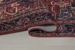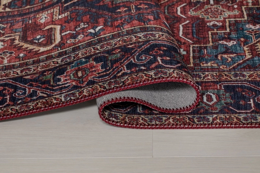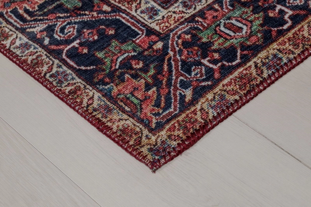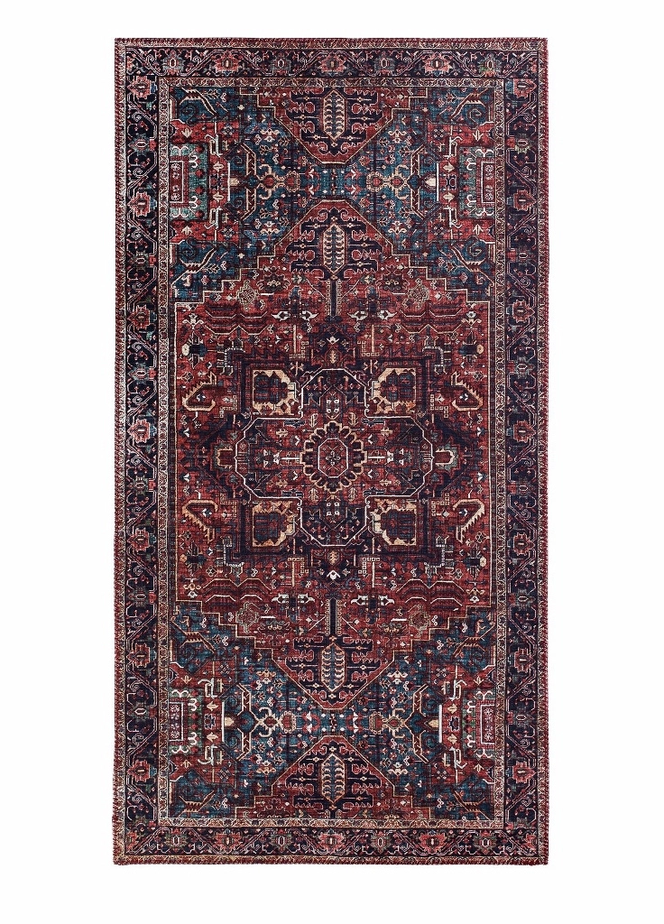 Cleo Kirman är en elegant matta med orientalisk inspiration. Mattan har en vinröd bottenfärg med tryckt mönster som går i tonerna creme, blå samt gröna inslag. Mattans kanter pryds utav en sydd langettering som består av riktiga stygn i matchande ton vilket ger en exklusiv och lyxig känsla.