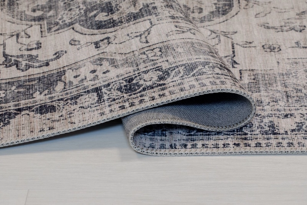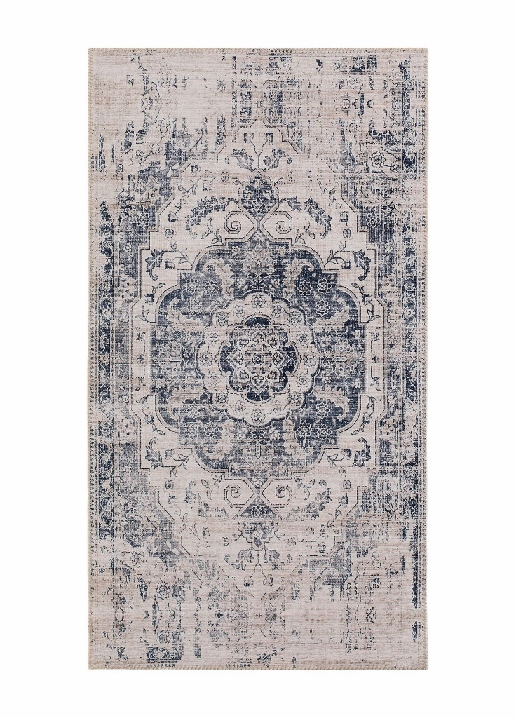 Cleo Medaljong är en elegant matta med orientalisk inspiration. Mattan har en ljusgrå bottenfärg med tryckt mönster som går i tonerna creme, samt blå inslag. Mattans kanter pryds utav en sydd langettering som består av riktiga stygn i matchande ton vilket ger en exklusiv och lyxig känsla.