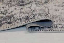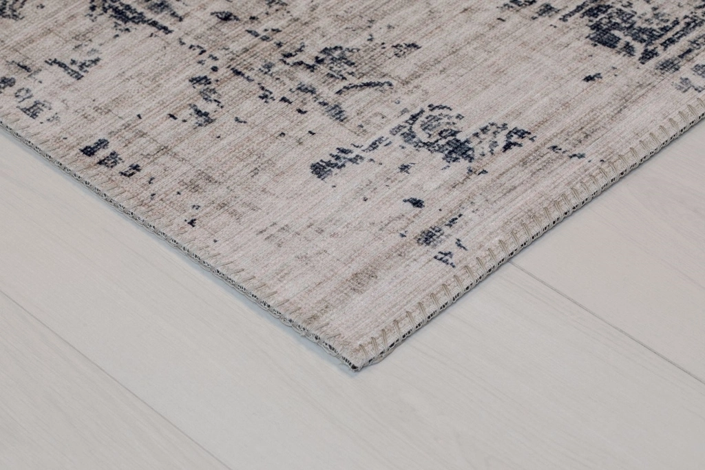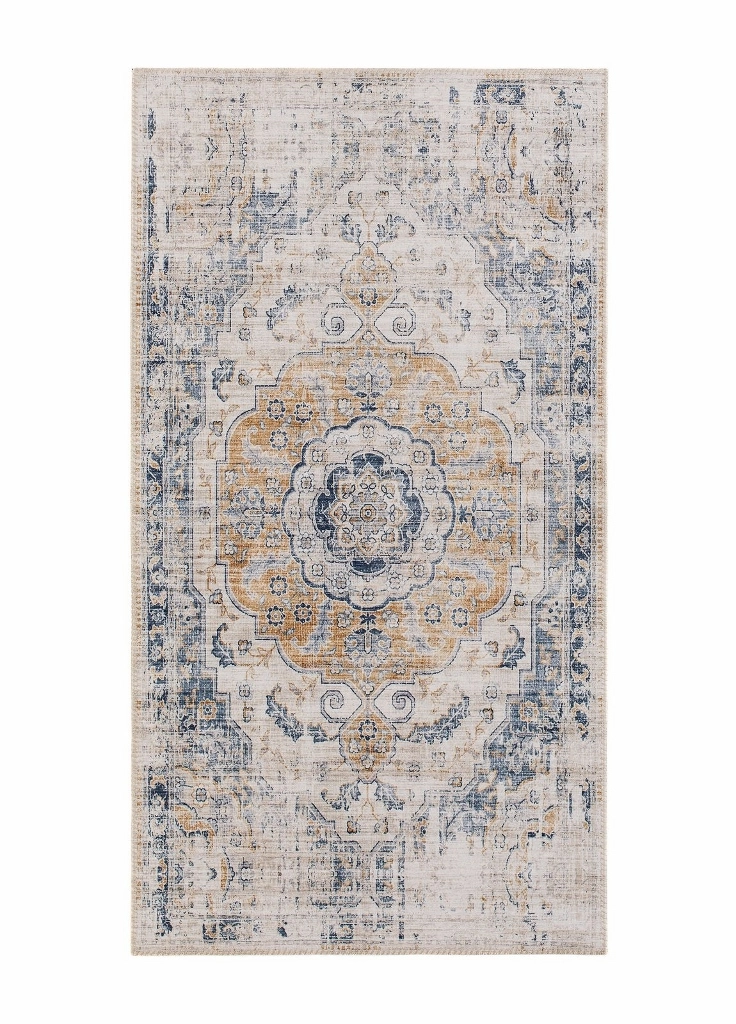 Cleo Medaljong är en elegant matta med orientalisk inspiration. Mattan har en ljusgrå bottenfärg med tryckt mönster som går i tonerna creme, guld samt blå inslag. Mattans kanter pryds utav en sydd langettering som består av riktiga stygn i matchande ton vilket ger en exklusiv och lyxig känsla.