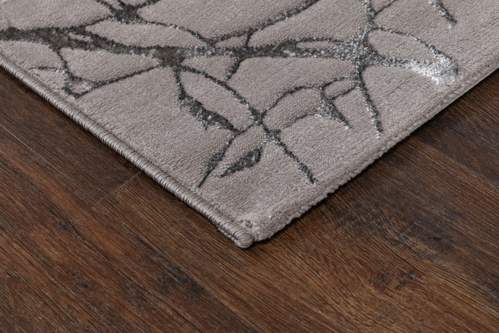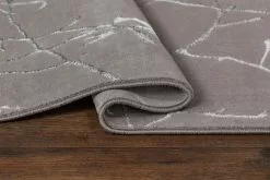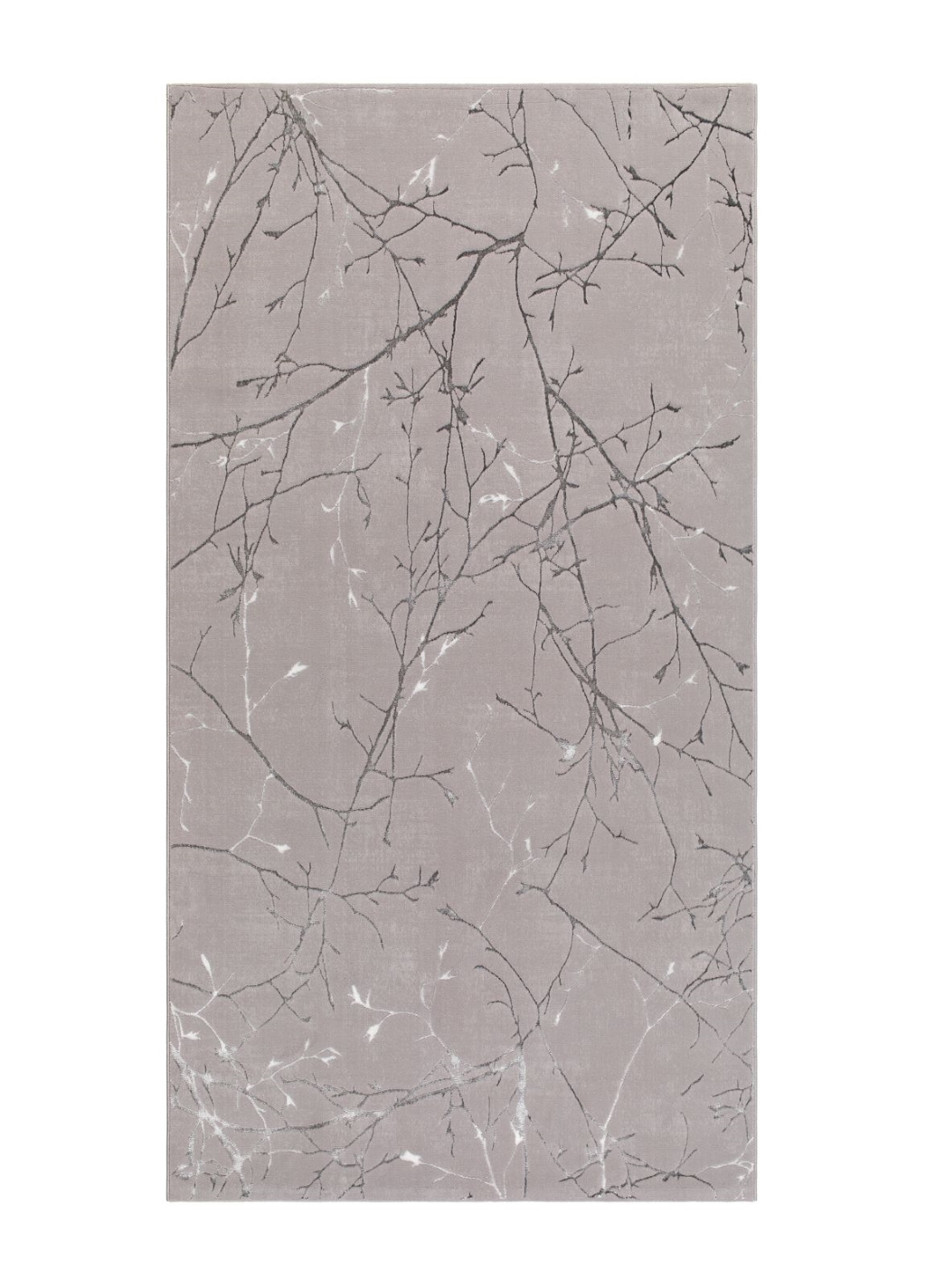 Creation Branch Grå har en kort skuren lugg med en grå botten och pryds av ett vackert mönster likt grenar från ett träd i en silvervit ton. Mattan har matchande langettering runt om och mönstret är tillverkat med polyestergarn, vilket innebär att vilket innebär att den har en jättefin lyster och gör mönstret mer framträdande. Creation är maskinvävd i polyester, vilket är ett syntetmaterial som är lätt att rengöra och hålla fri ifrån ludd och damm. Eftersom den har korta fibrer så tränger inte smuts in lika lätt som på en matta med längre fibrer.