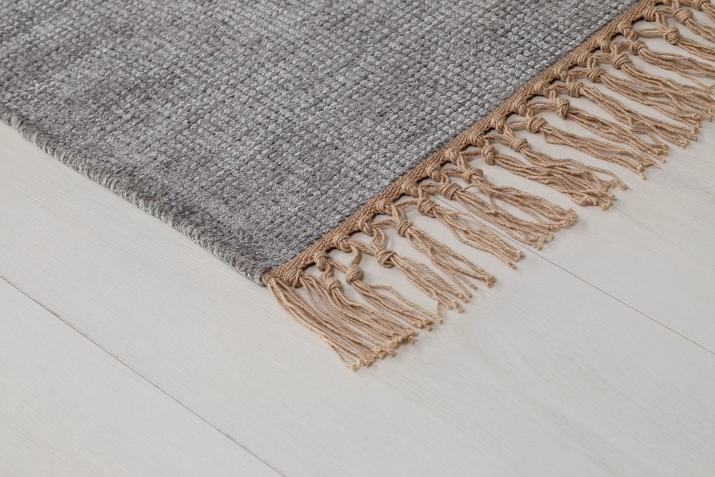 Dover viskosmatta har en grå bottenfärg. Mattan har dekorativa fransar i kortändarna som går i naturton. Eftersom Dover är vävd i 100% viskos så har mattan en jättefin lyster som ger en skimrande effekt, beroende på hur ljuset faller.För att få extra säkerhet så kan man addera antiglid/ antihalkskyddsmatta under mattan för att vara säker på att mattan alltid ligger på rätt plats
