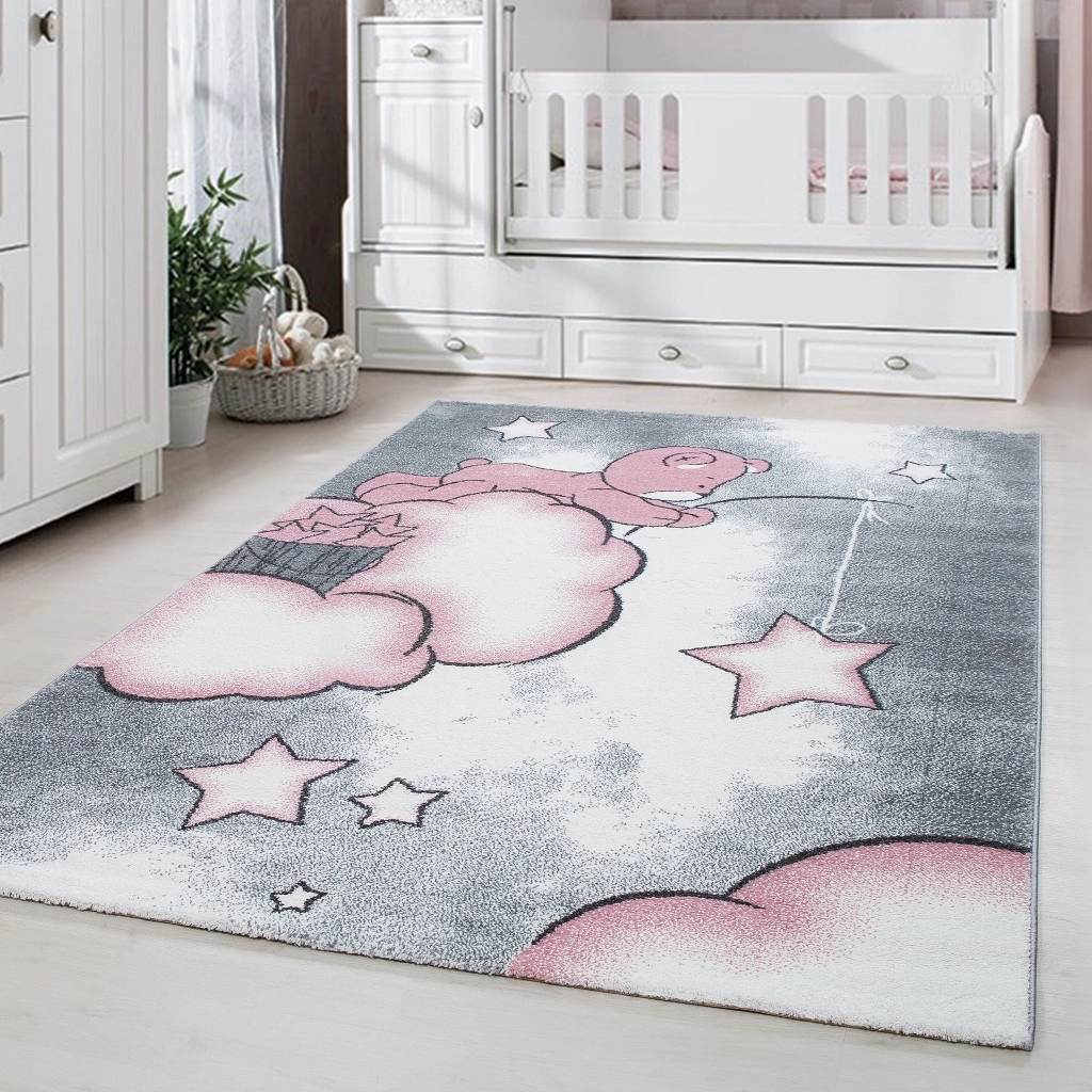 Fishing Bear har grå/vit bottenfärg som pryds av flera stjärnor, fluffiga moln och en söt björn. Fishing Bear är maskinvävd i polypropylen, vilket är ett syntetmaterial som är lätt att rengöra och hålla fri ifrån ludd och damm.