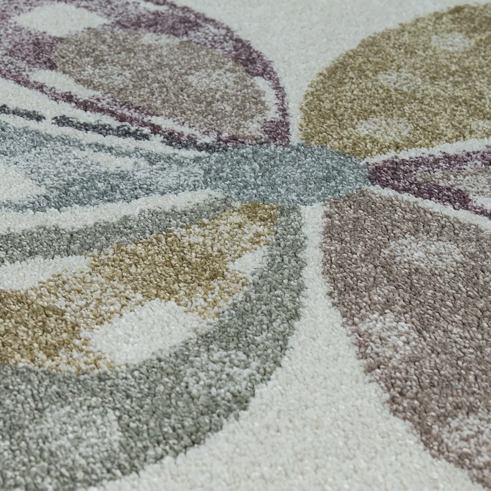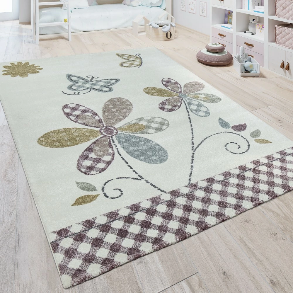 Barnmattan Flower Field är mjuk och skön att sätta fötterna på. Med sina pastell färger och mönster ger mattan barnrummet färg och liv.