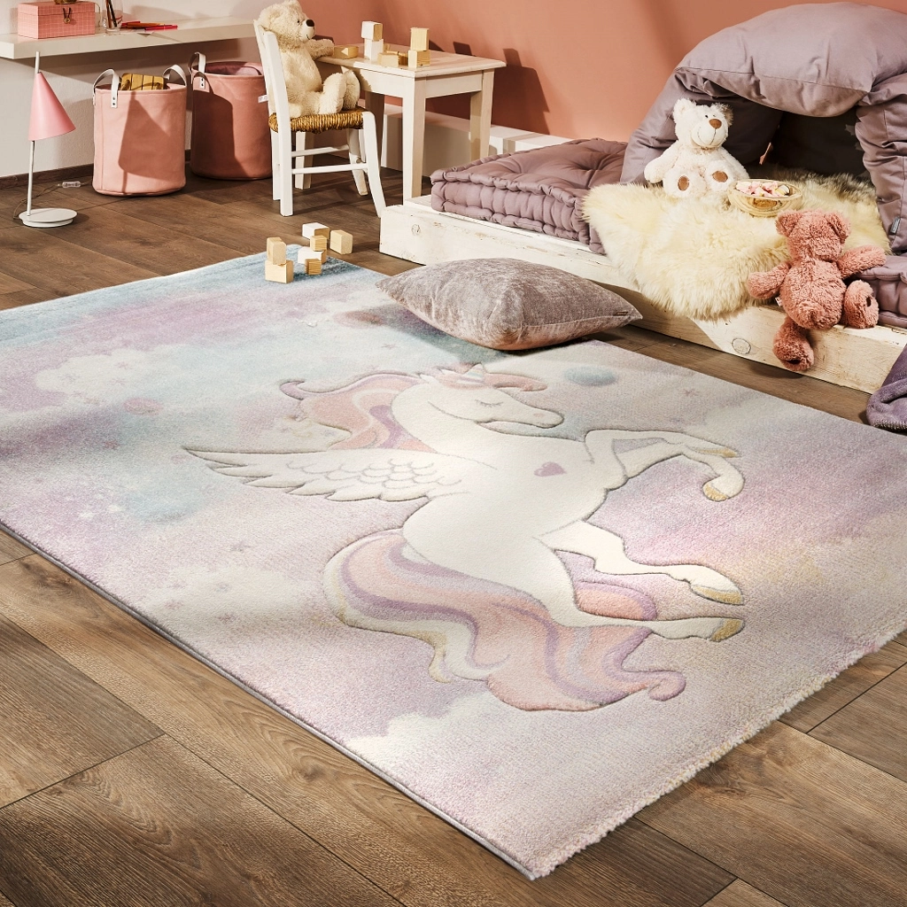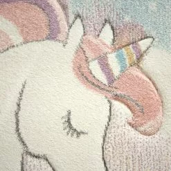 Fluttershy är en maskinvävd matta som har olika pastelltoner i bottenfärg och matchande langettering. Mattan pryds av en vit enhörning som har vita vingar och pastellfärgad man och svans. Enhörningen omges av vita stjärnor och moln. Fluttershy har en kort skuren lugg i polypropylen, vilket är ett syntetmaterial som är lätt att rengöra och hålla fri ifrån ludd och damm.