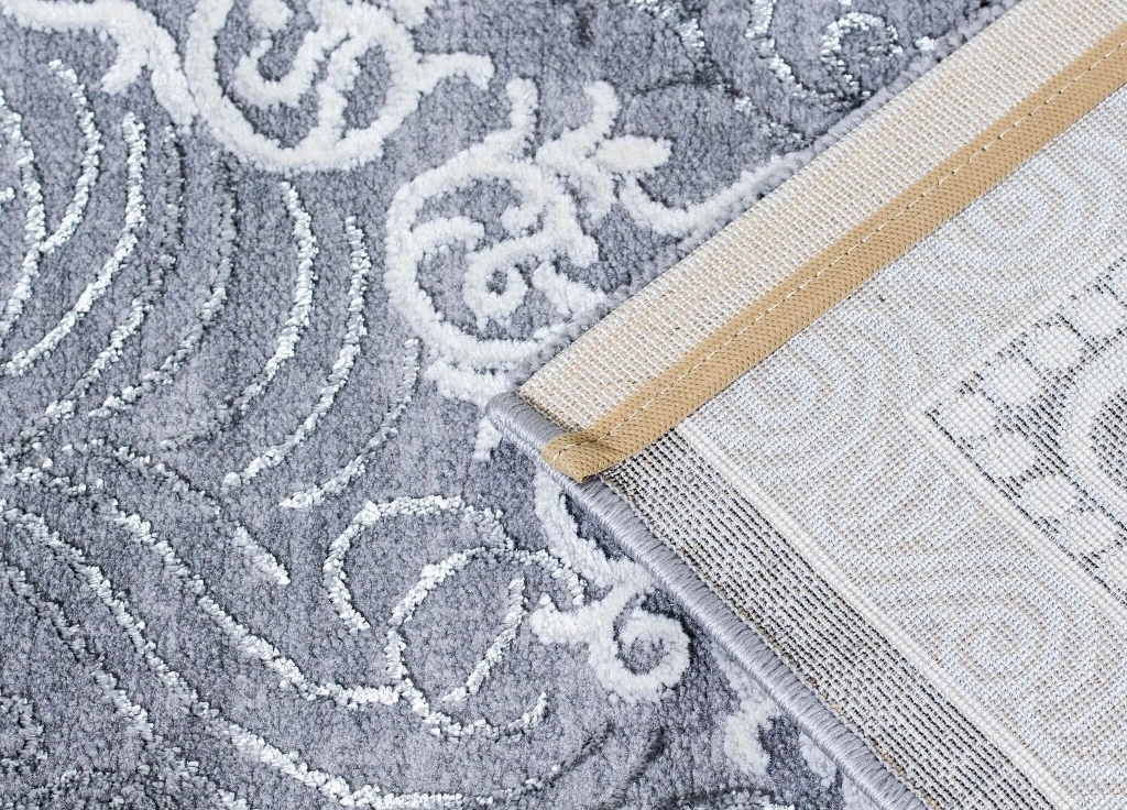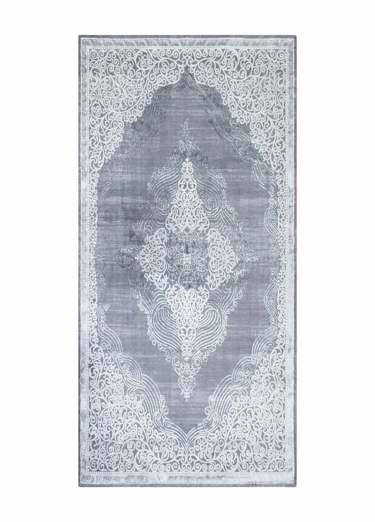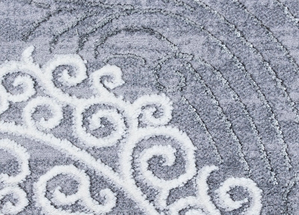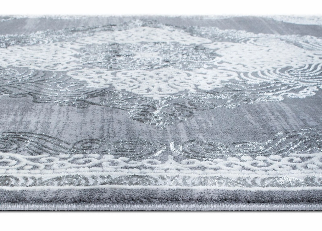 Kameha Medallion har en grå bottenfärg med matchande langettering. Mattan har ett vit-silvrigt medaljongmönster som är gjort i high/low-effekt, vilket gör mönstret mer framträdande. Kameha Medallion är vävd med polyestertrådar, vilket ger mattan en vacker lyster och beroende på hur ljuset faller så får mattan en skimrande effekt.
