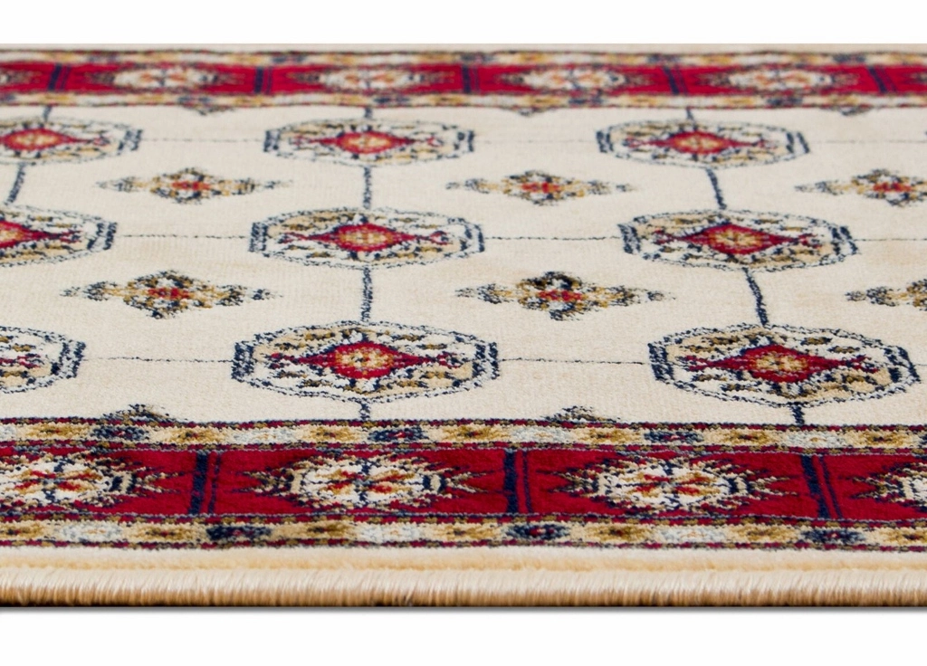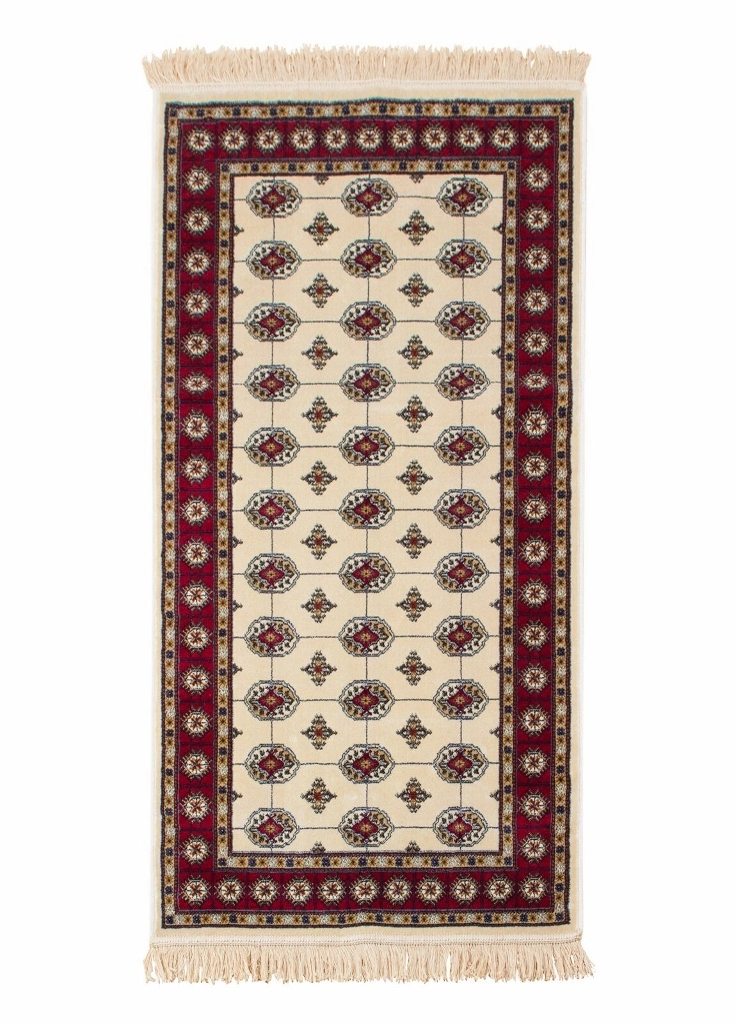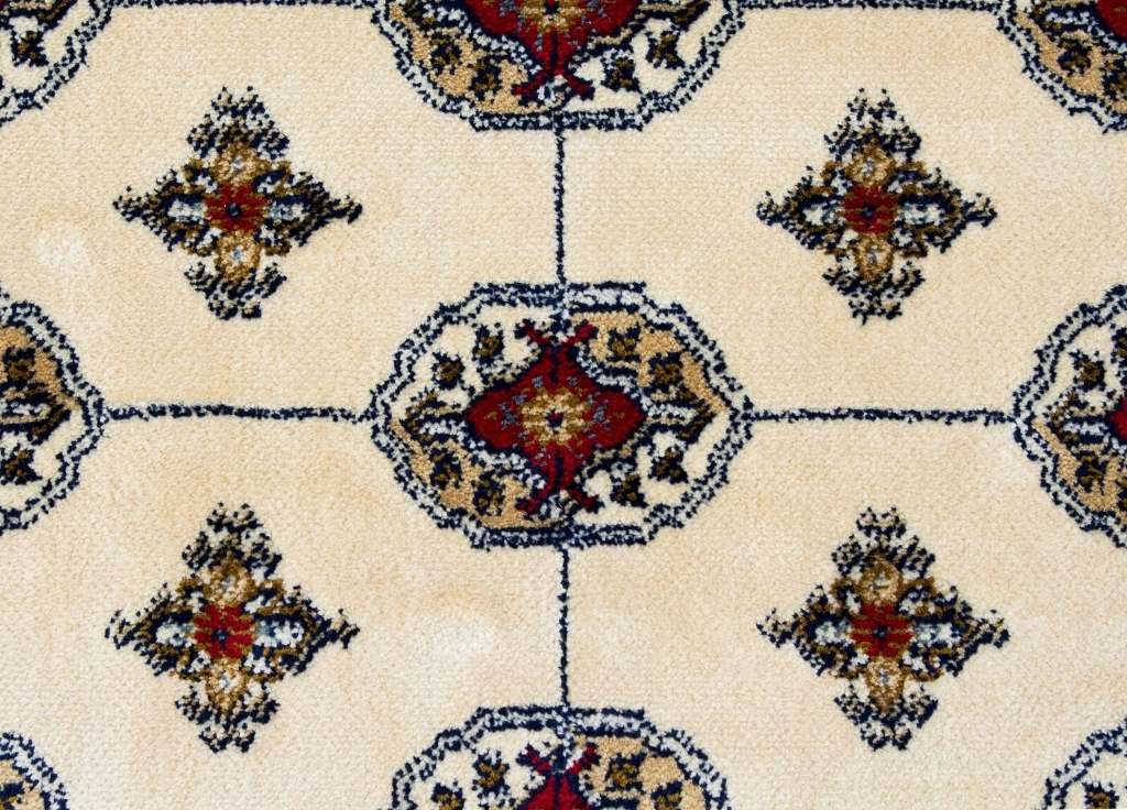 Kashmir Boccara har ett klassiskt boccaramönster där mattan har en cremevit bottenfärg och detaljer i blått och rött. Mattan har en cremevit langettering på långsidorna medan kortsidorna på mattan pryds av cremevita fransar. Beroende på hur ljuset faller på mattan så kan färgerna skifta i färgstyrka men även mellan varm och kall ton. Eftersom Kashmir Boccara är gjord i viskos som påminner om silke, så har mattan en fin lyster och är även väldigt mjuk.