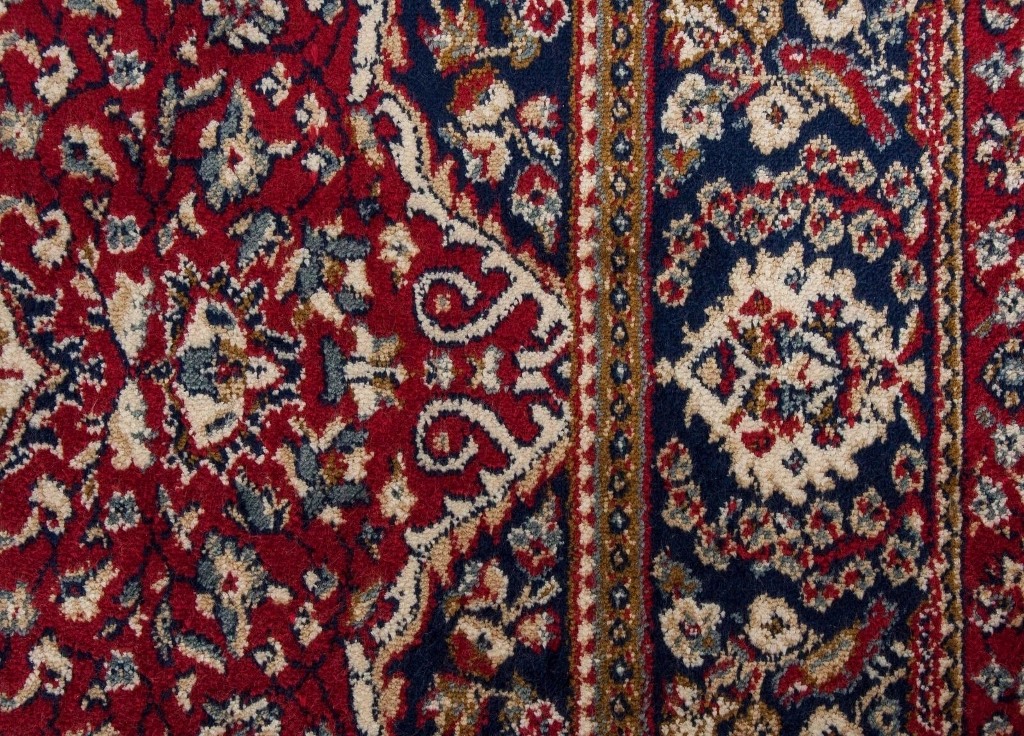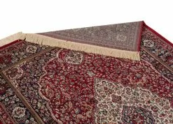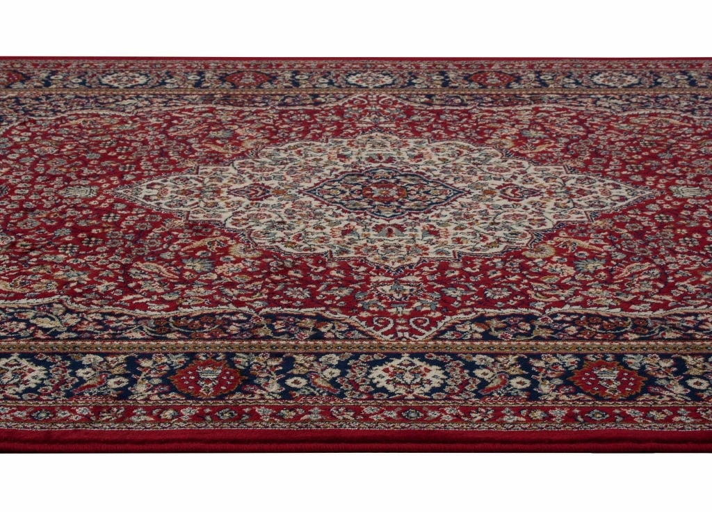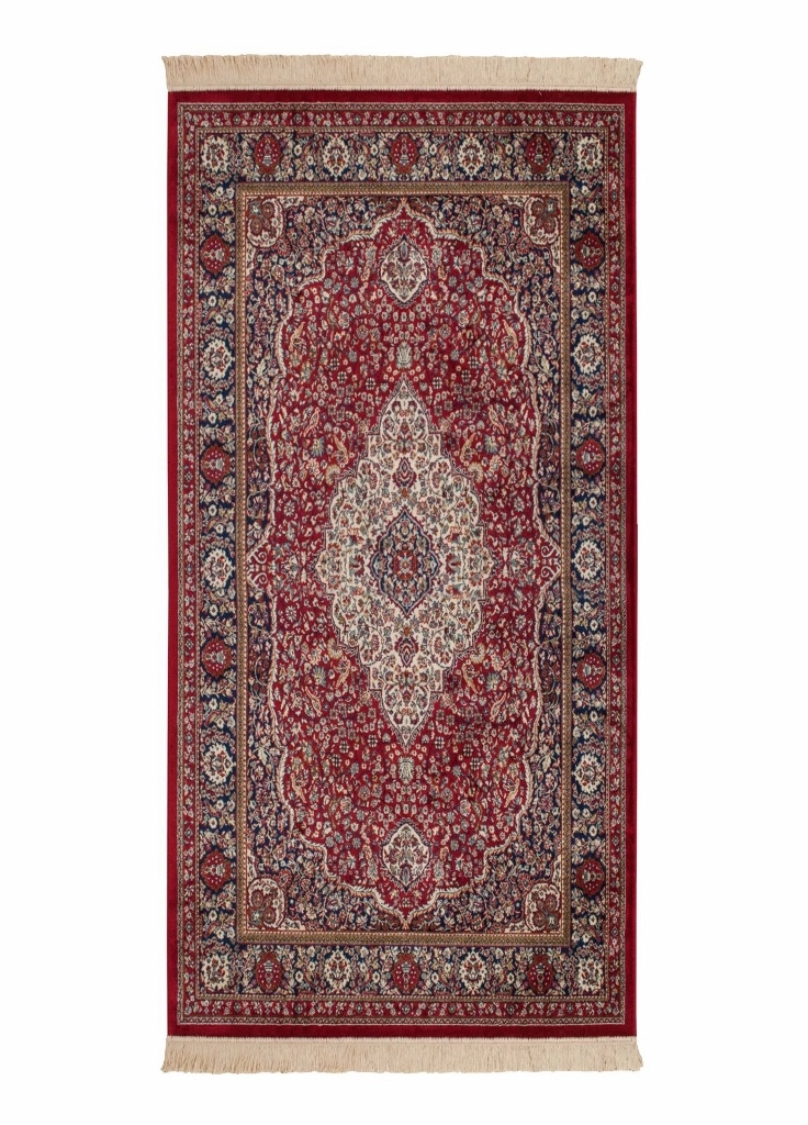 Kashmir Medallion har en röd bottenfärg med klassiskt orientaliskt mönster. Mattan har en bård som löper runt ett detaljrikt blommönster i röda och blå toner. Kortändarna på mattan pryds av dekorativa fransar.
