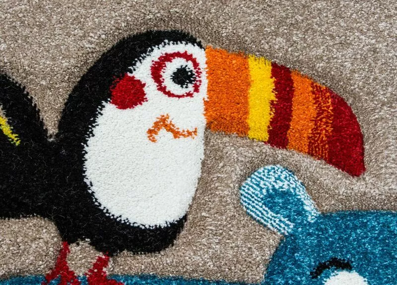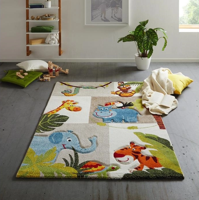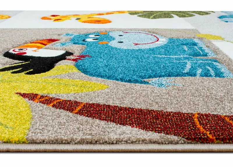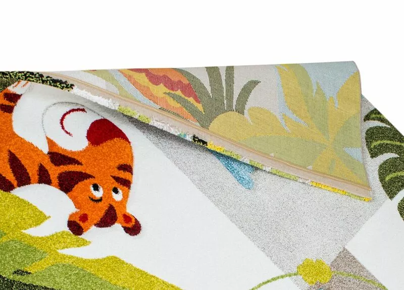 London Djungel har ett rutmönster i vita och beige toner som pryds av ett färgglatt mönster. Mönstret består av tropiska växter och djur såsom palmer, elefant, orm, giraff osv. Färgerna går i knalliga toner av gult, grönt, blått och orange. Mattan är gjord i carvingteknik, vilket innebär att den är gjord med utskärningar för att på så sätt få färger och detaljer mer framträdande och ge en större effekt.