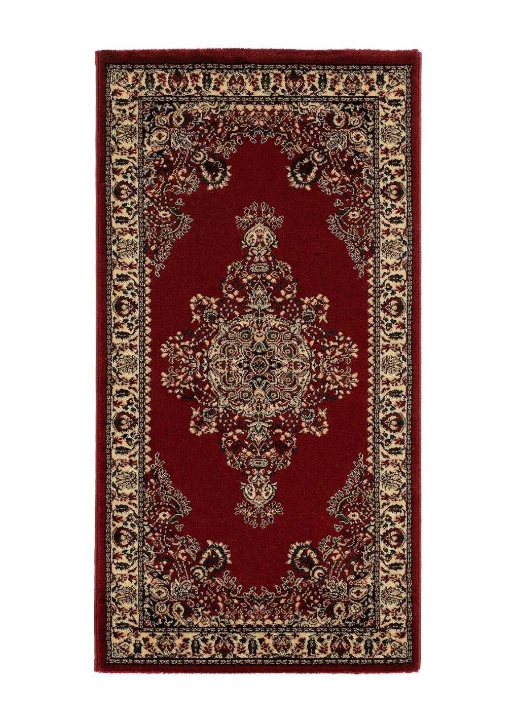 Medina är en klassisk wiltonmatta med ett vackert medaljongmönster. Mattan har en kort tät skuren lugg. Här ser du Medina i färgen röd.