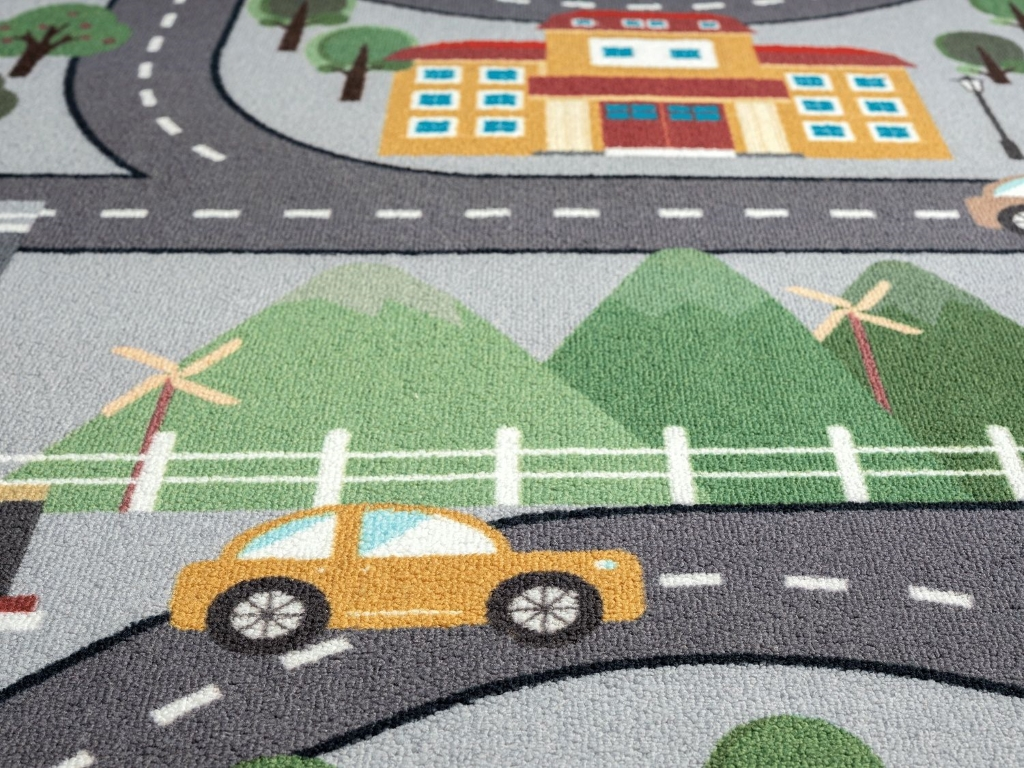 Play Road Grå är en barnmatta med tryck av en stad med vägar där dina leksaksbilar kan köra eller hästar kan galoppera. Denna mattan har en stad tryckt på grå botten. En matta som ger en fin färgklick i ditt rum och bjuder in till många timmars lek. Då mattan har en gel-baksida ligger den säkert på plats under leken. Skulle olyckan vara framme så går det bar att tvätta mattan i 30grader i maskin.