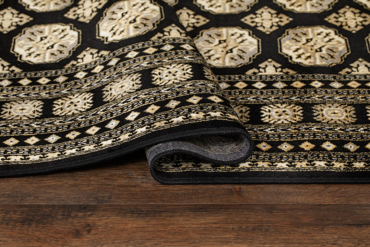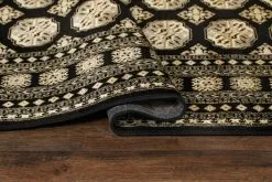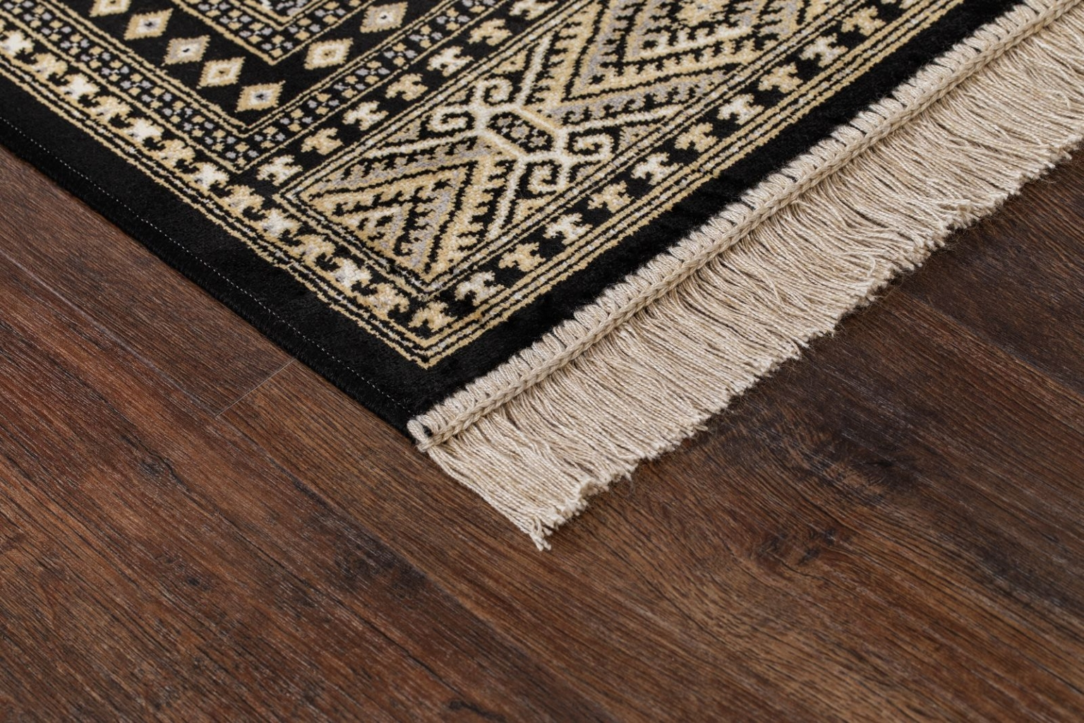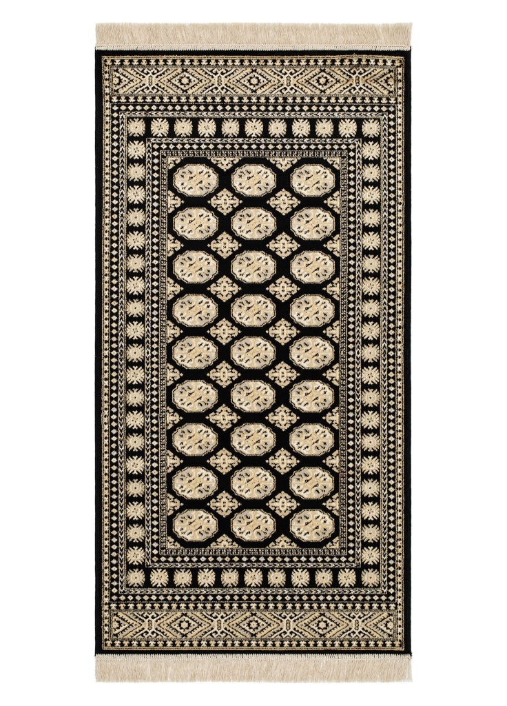 Side Boccara Svart med ett klassiskt boccaramönster i natur och grått på en svart botten. Kanterna pryds av en matchande langettering och kortsidorna har en nätt frans i crème som ger ett lyxigt avslut. Mattan passar lika bra att placera i vardagsrummet under soffan som i sovrummet under sängen.