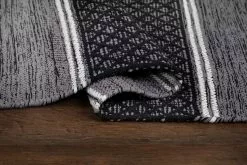Solhaga garnmatta har en grå bottenfärg som varvas med ett fint dekorativt mönster i svart och ett randigt mönster i vitt. På kortsidorna har mattan svartfärgade fransar som matchar resten av mattan. Mattan är vändbar och kan användas på båda sidor, vilket ger en hög användningsgrad eftersom man på så sätt får två mattor i en.