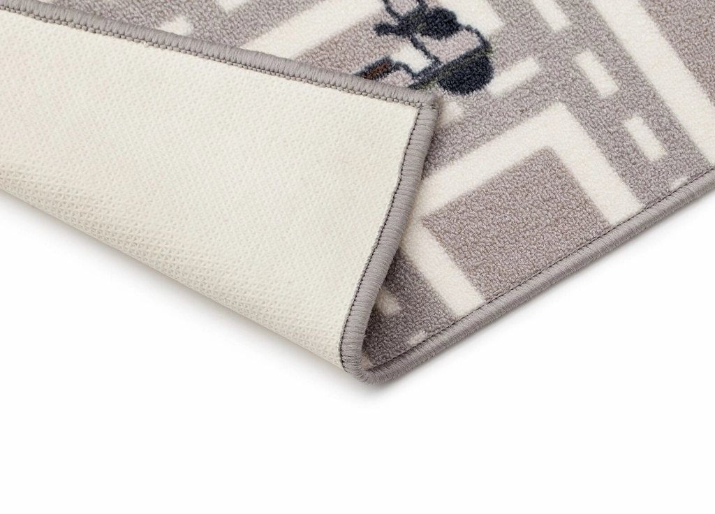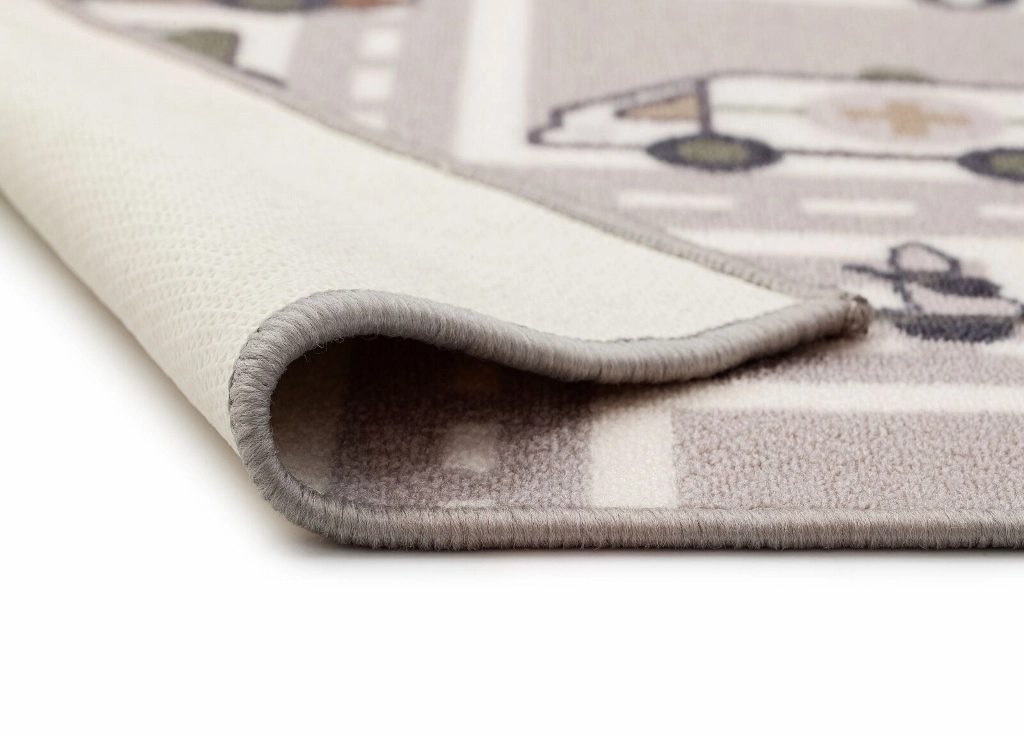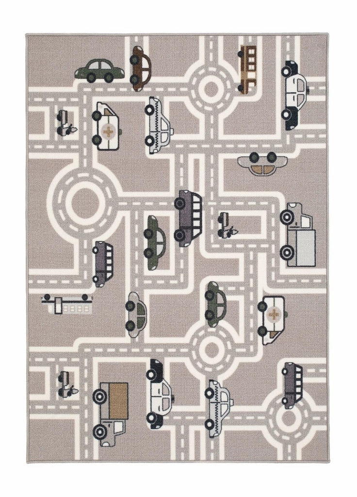 Vägmatta grå är en både stilren och lekfull matta vars mönster består av vägar och olika fordon som bjuder in till lek. Man får se upp var man kör eftersom mattan har både rondeller, bussar och lastbilar att hålla koll på. Vägmatta grå har grå bottenfärg med matchande langettering och baksidan är gummerad, vilket gör att mattan ligger stadigt på plats.